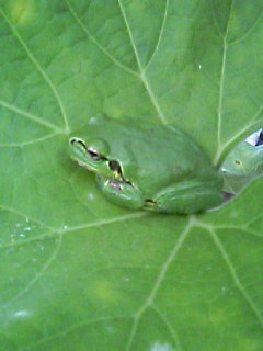ここ最近に限ったことじゃないけど、ひょうたんの葉っぱの上によくカエルが居る。 雨降った次の日とか、三匹ぐらい見かけるね。 今日も、撮り易い場所に一匹居たので一枚撮らせてもらいました。 謝礼は手酌で水を一杯。喜んでたよ! なんでこぞってこんな場所に居るんだか。本人は身を隠してるつもりなのかもしれないけど、私にはバレバレです。 オマエさんら…私が諏訪子好きじゃなかったら一匹残らずナマズのエサだというのに…運のいいやつめ。 カエル可愛い。 でもこの辺最近、神奈子ってかヘビ出るから気をつけてね! アオダイショウだかマムシだか知らんけど、天敵なのには変わりあるまい。 あーうー。 |
